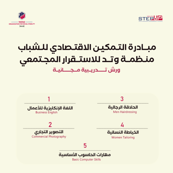 ورشة التصوير التجاريPro.int3rnet@gmail.com2023-03-05تعلن منظمة وتــد للأستقرار المجتمعـي ضمن برنامج Step Up Youth عن فتح باب التسجيل في ورشة التصوير التجاري . محاور ... قراءة المزيد